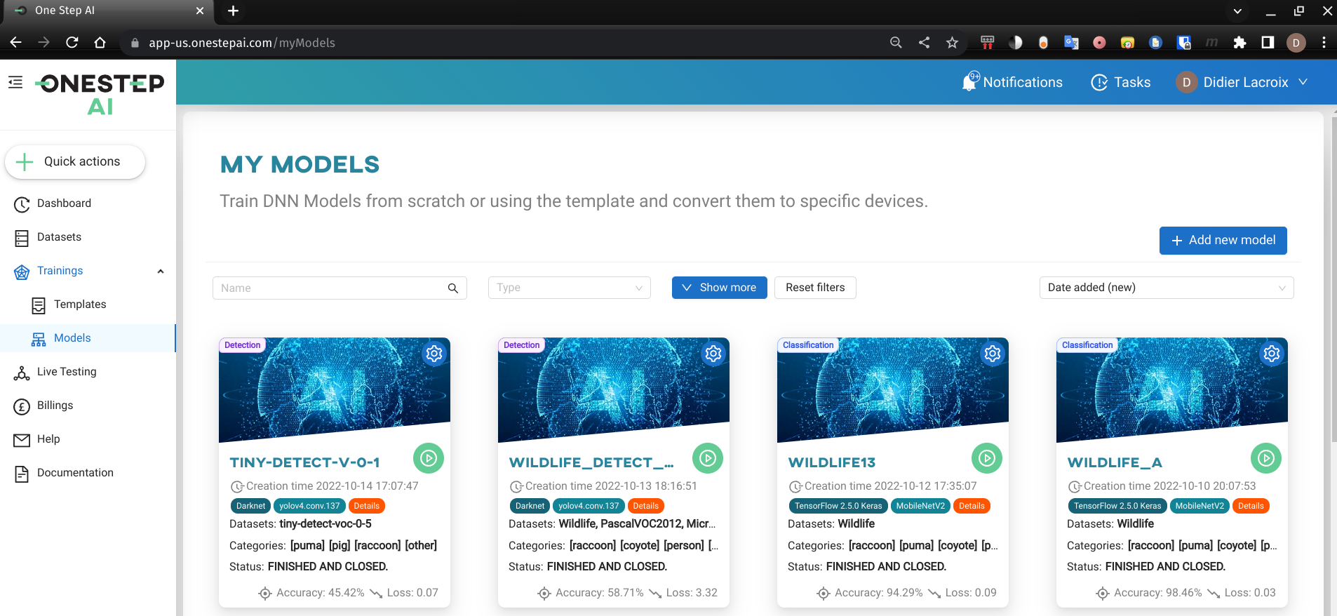 After combining all the datasets, it was time to create the model. As you see below, it is effortless and fast to get quickly several models trained.