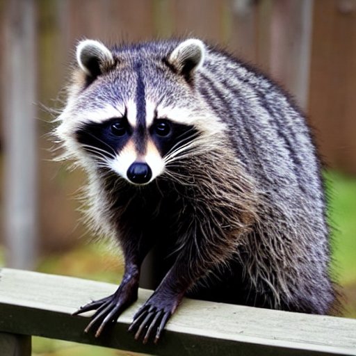 Using a GUI, you enter simple text prompts and create tens of images in short order. Here is a text prompt of “raccoon sitting on top of a fence” :